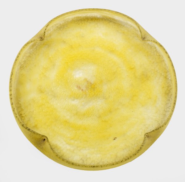 Jugendstil-Zierteller von Daum Flache, vierpassig gekniffene Form mit hochgezogenem Rand. Farbloses Glas mit gelben Pulvereinschmelzungen, eisartig geätzt. Sign. "Daum Nancy" mit Lothringer Kreuz. D. 19,3 cm.
