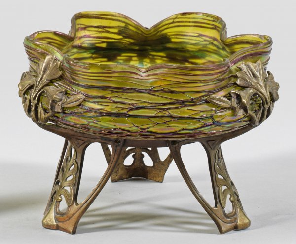 Jugendstil-Glasschale mit Bronzemontierung Gemuldeter, leicht gebauchter Korpus mit sechspassig gekniffenem Rand aus grünem Glas, dekoriert mit netzartig aufgesponnenen, violetten Glasfäden, reduziert und irisiert. Durchbrochen gearbeitete, reliefierte Montierung aus braun patinierter Bronze mit dreifach ausgestelltem Fuß und stilisiertem Liliendekor. H. 17 cm; D. 24 cm.
