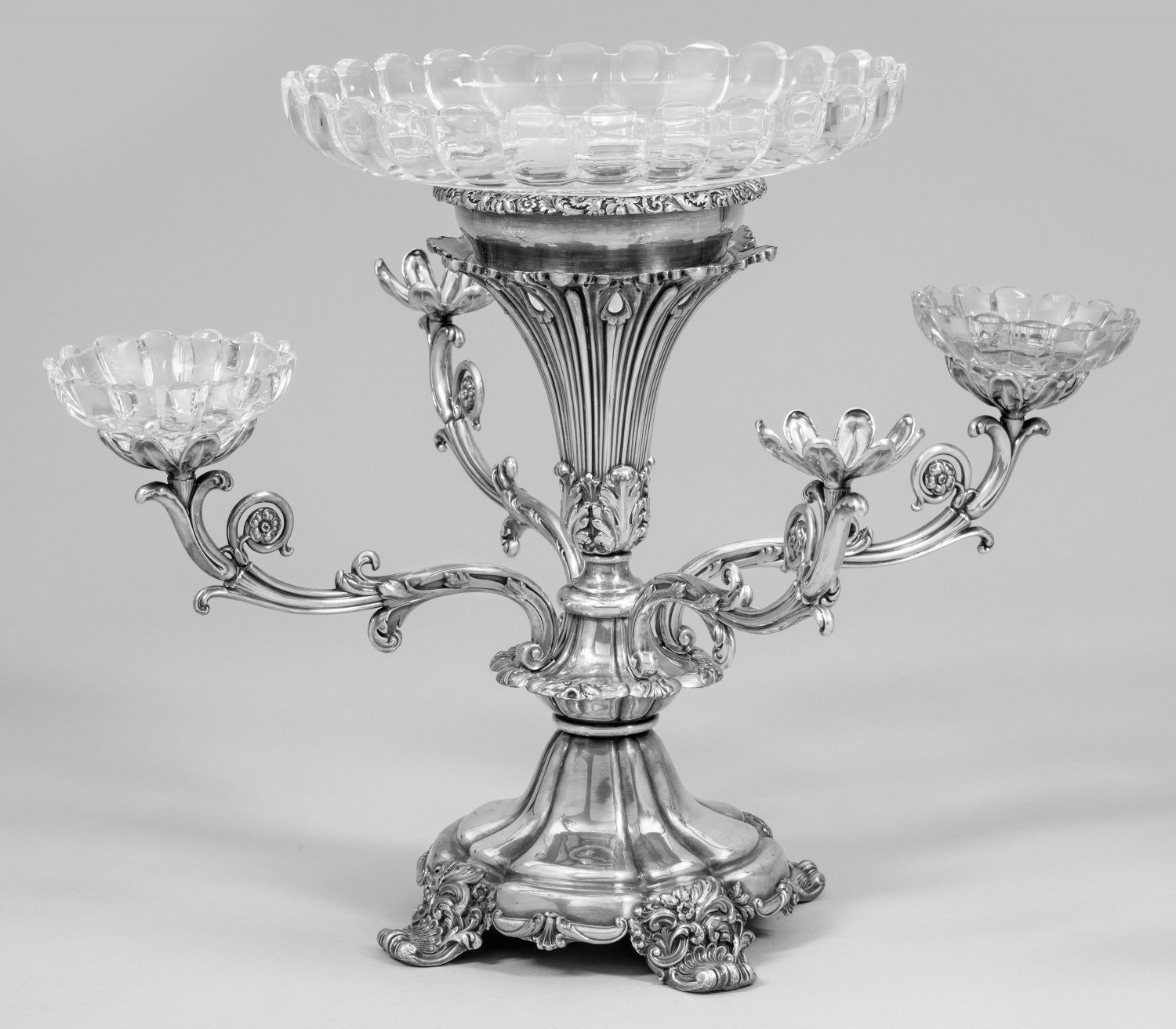 Großer Tafelaufsatz Plated. Auf vier Volutenfüßen getragener aufgewölbter, passiger Stand. Mehrfach gegliederter Balusterschaft. Davon ausgehend vier herausnehmbare Leuchterarme mit Voluten und reliefplastischen Akanthusblättern in blütenförmigen Tüllen endend. Darüber ein blütenkelchförmiger kannelierter ausschwingender Korpus mit durchbrochener Wandung und umlaufenden Akanthusfries. Geschliffener Kristallglaseinsatz. Zwei Glaseinsätze fehlen. Gew. ohne Glaseinsätze ca. 5000 g. H. 36,5 cm.