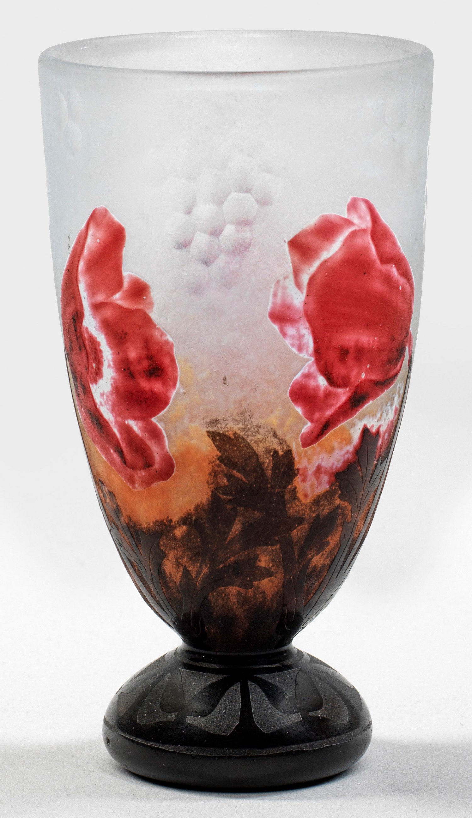 Seltene Jugendstil-Vase mit "Pavots d'orient"-Mohndekor Gefußte Becherform. Farbloses Glas, Unterfang unterhalb mit ockerfarbenen Pulvereinschmelzungen, der Überfang mit akzentuierten Einschmelzungen und Aufschmelzungen in Weiß, Rot und Dunkelbraun. In mehreren Arbeitsgängen geätzter und geschnittener Dekor aus blühenden Stängeln des Türkischen bzw. Orientalischen Mohns (Papaver orientale), die Blüten fein mit dem Rad überarbeitet, im Hintergrund einzelne martellierte, traubenartige Partien. Entw. wohl Henri Bergé. Geschnittene Sign. "Daum Nancy" mit Lothringer Kreuz. H. 18,3 cm.