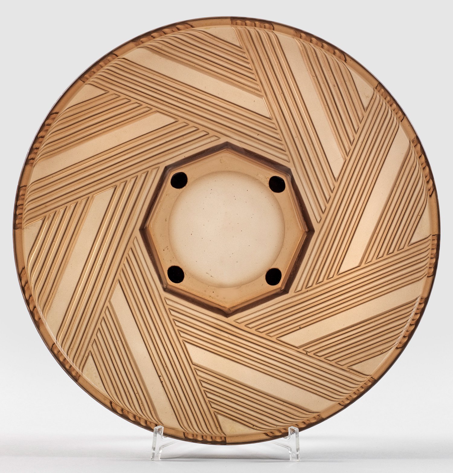 Große Schale von Pierre d'Avesn Runde, flache Form. Rauchglas mit geometrischem Reliefdekor, in die Form geblasen, unterhalb satiniert. Entw. Pierre d'Avesn. Sign. "D' AVESN FRANCE". D. 39,8 cm.