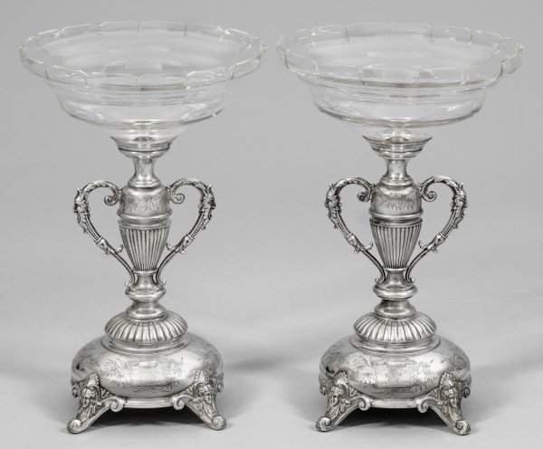 Paar Tafelaufsätze Silber. Von Volutenfüßen mit plastischen weiblichen Maskarons getragener, hoch aufgewölbter Stand mit gravierten floralen Motiven und einer Monogrammkartusche. Hoher, von reliefplastischen Zungenfriesen umzogener Schaft in Form einer Henkelvase mit Maskarons. Oberhalb leicht gemuldete, geschliffene Kristallglasschale. Glaseinsätze minim. besch. Garantiemarke Dianakopf mit A (Wien 1867 - 1922), Herstellerzeichen. Gew. mit Glaseinsatz ca. 1532 g. H. 31,5 cm.