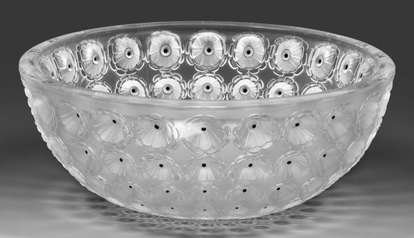 Lalique "Nemours"-Schale Farbloses Glas, in die Form geblasen, satiniert und teilw. poliert, Blütenzentren mit schwarzen Email-Punkten. Entw. René Lalique, um 1929. Gem. "Lalique France". D. 25,3 cm.