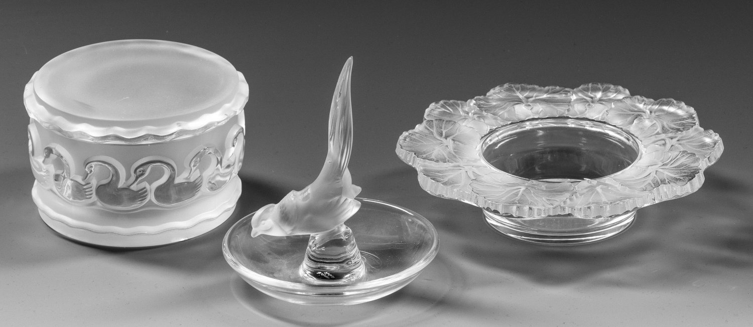Drei Lalique-Glasobjekte Farbloses Glas, in die Form geblasen, satiniert, teilw. geschliffen poliert. Kleine Schale mit Blattdekor, Dose mit Schwanenfries und Ringhalter mit Vogelfigur. Gem. "Lalique France". H. 3,8 cm-9,5 cm; D. 9,5 cm-14,8 cm.