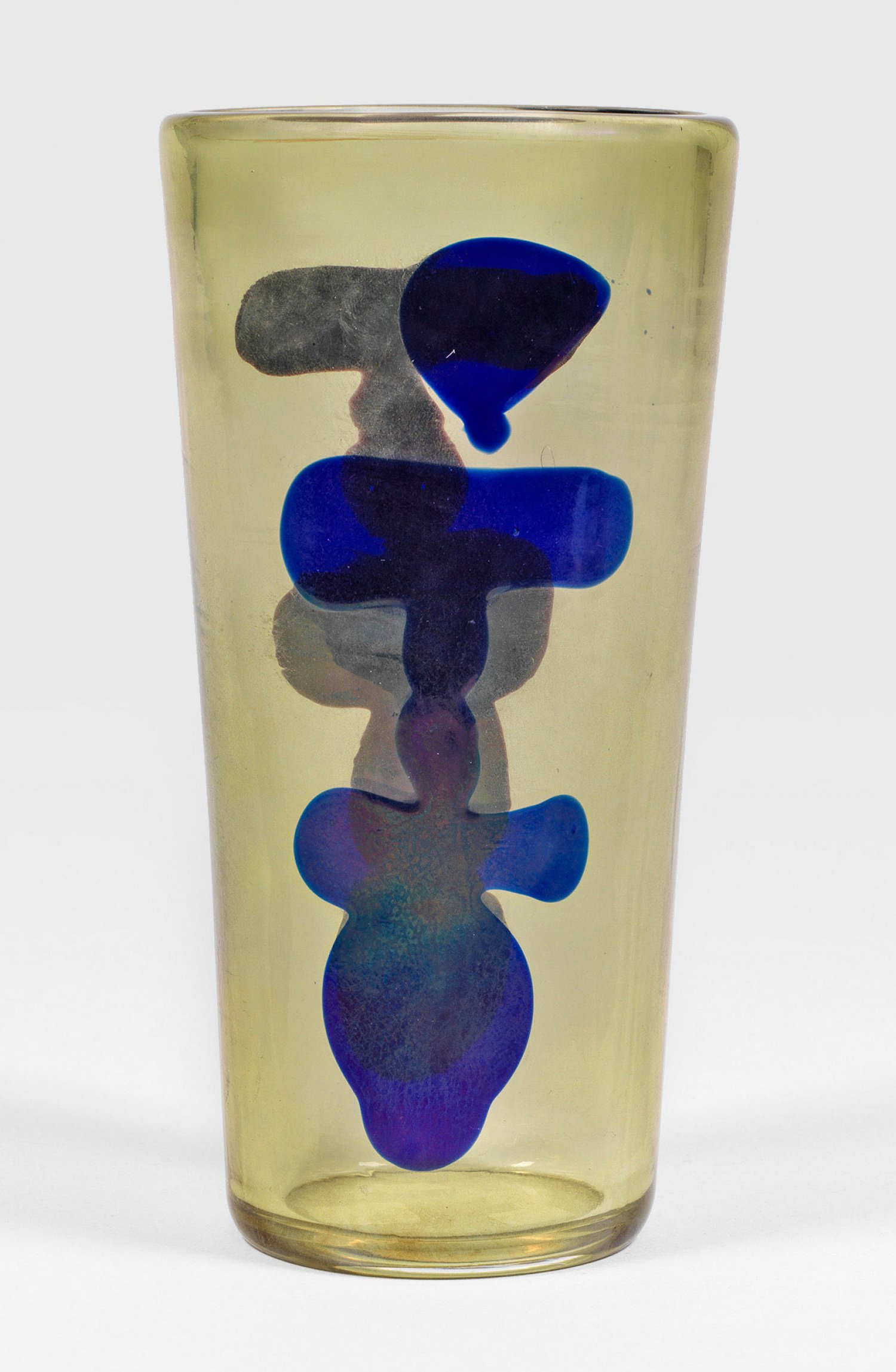Bedeutende Vase "A macchie" von Fulvio Bianconi In Oval gedrückte, zylindrische Becherform. Hellbernsteinfarbenes Glas. Beidseitig abstrakter "A macchie"-Fleckendekor als dunkelblaue bzw. schwarzviolette Farbeinschmelzungen, irisiert. Modell Nr. 4323. Entw. Fulvio Bianconi für Venini, 1950. H. 26 cm.