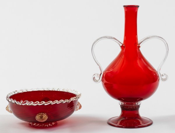 Murano-Vase und Schale Im Renaissance-Stil gestaltete Formen. Doppelhenkelvase mit Glockenfuß und Enghals, die schrägoptisch geblasene Schale mit gewellt gekniffenem Fuß und Rand sowie Beerennuppenauflagen. Rubinrotes und farbloses Glas, teilw. mit Goldeinschmelzungen. Vase mit Venini-Firmenetikett. H. 8 cm-31 cm; Schalen-D. 19 cm.