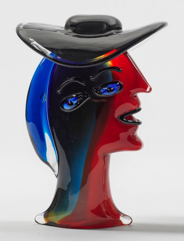 Moderne Murano-Glasskulptur mit weiblichem Profilkopf Stilisierter weiblicher Kopf mit Hut als Hommage an Pablo Picasso. Farbloses Glas in Kombination mit Auf- und Einschmelzungen sowie Unterfängen aus farbigem, schwarzem und weißem Glas. H. 31 cm.