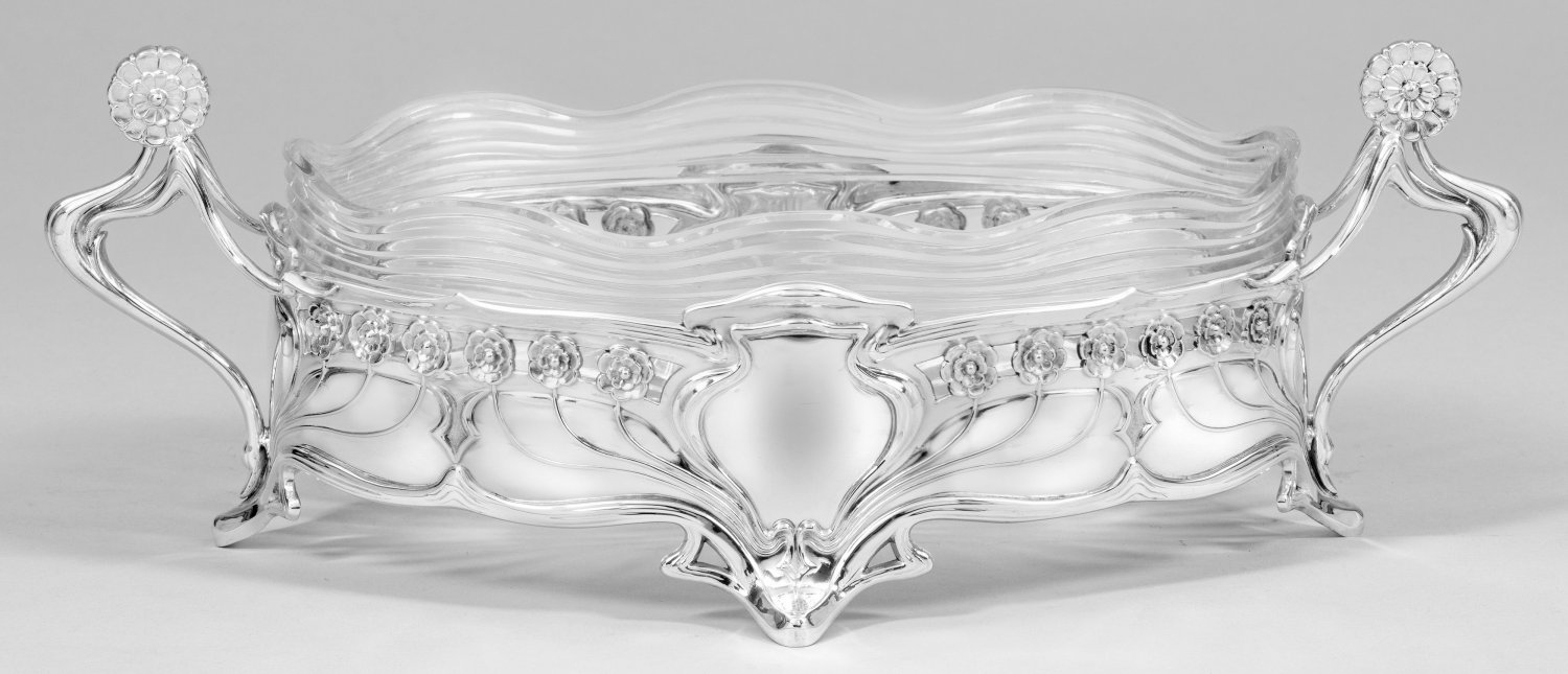 Jugendstil-Jardiniere Silber, originaler Einsatz aus geschliffenem Kristallglas. Ovale, teilw. durchbrochen gearbeitete Form auf vier Füßen, linear stilierter Reliefdekor aus Blütenstängeln, korrespondierend an den Seiten zwei ausgezogene, gegenständige, als Blätter bzw. Stängel gestaltete Henkel mit rosettenförmigen Blüten. Modell-Nr. 37529, Entw. 1900/01. Der Glaseinsatz mit gerader hochgezogener Wandung, gewellt geschliffenem Rand und Bodenrosette. Gew. ca. 682 g (ohne Einsatz). H. 15 cm; B. 45,5 cm.