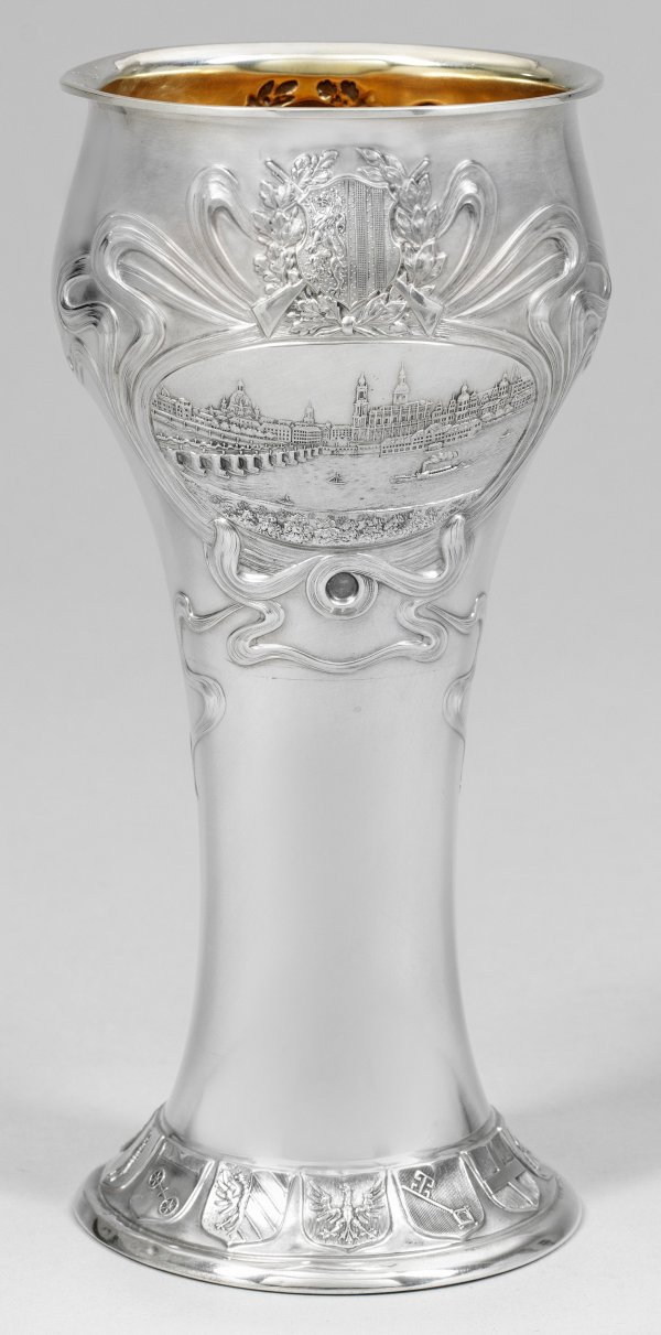 Dresdener Jugendstil-Schützenpokal Silber. Über rundem Stand trompetenförmiger Schaft. Fuß umzogen mit zwölf plastischen Stadtwappen. Frankfurt am Main, Bremen, Wien, Hannover, Stuttgart, Düsseldorf, München, Leipzig, Frankfurt am Main, Berlin, Mainz, Nürnberg. Beidseitig der Wandung mit geschwungenem Bandwerk umzogene Kartuschen. Inschrift: "XIII. Deutsches Bundesschießen DRESDEN 1900". Gegenüberliegend reliefplastische Stadtansicht Dresdens mit Frauenkirche und Residenzschloss. Gewölbter Lippenrand. Innen vergoldet. Teilw. best., Gebrauchsspuren. Gest. 800, Herstellerzeichen, Juweliermarke Heinrich Mau, Dresden. Gew. ca. 360 g H. 24 cm. D. 11 cm.