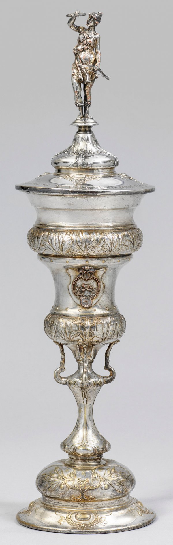 Würzburger Schützenpokal Messing, versilbert. Aus der Grundform eines Blütenkelchs entwickelter, mit üppiger floraler Jugendstil-Ornamentik reliefierter Pokal. Auf der Kuppa reliefplastisch aufgelegtes Würzburger Stadtwappen, gegenüber ein Medaillon mit Stadtansicht mit Schützenscheibe. Auf dem Deckel in Zierschrift graviert: "Dem Schützenkönig 1902 Herrn Theaterdirektor Heinrich Adolphi die Würzburger Schützengilde". Als Deckelbekrönung eine vollplastische Viktoria mit Siegerkranz. Der Pokal wurde von der "Kgl. priv. Hauptschützengesellschaft Würzburg von 1392" vermutlich explizit bei einem Metallkunst-Betrieb in kleiner Serie in Auftrag gegeben und für die Verleihung an den Schützenkönig über einige Jahre verwendet. H. 55,5 cm.