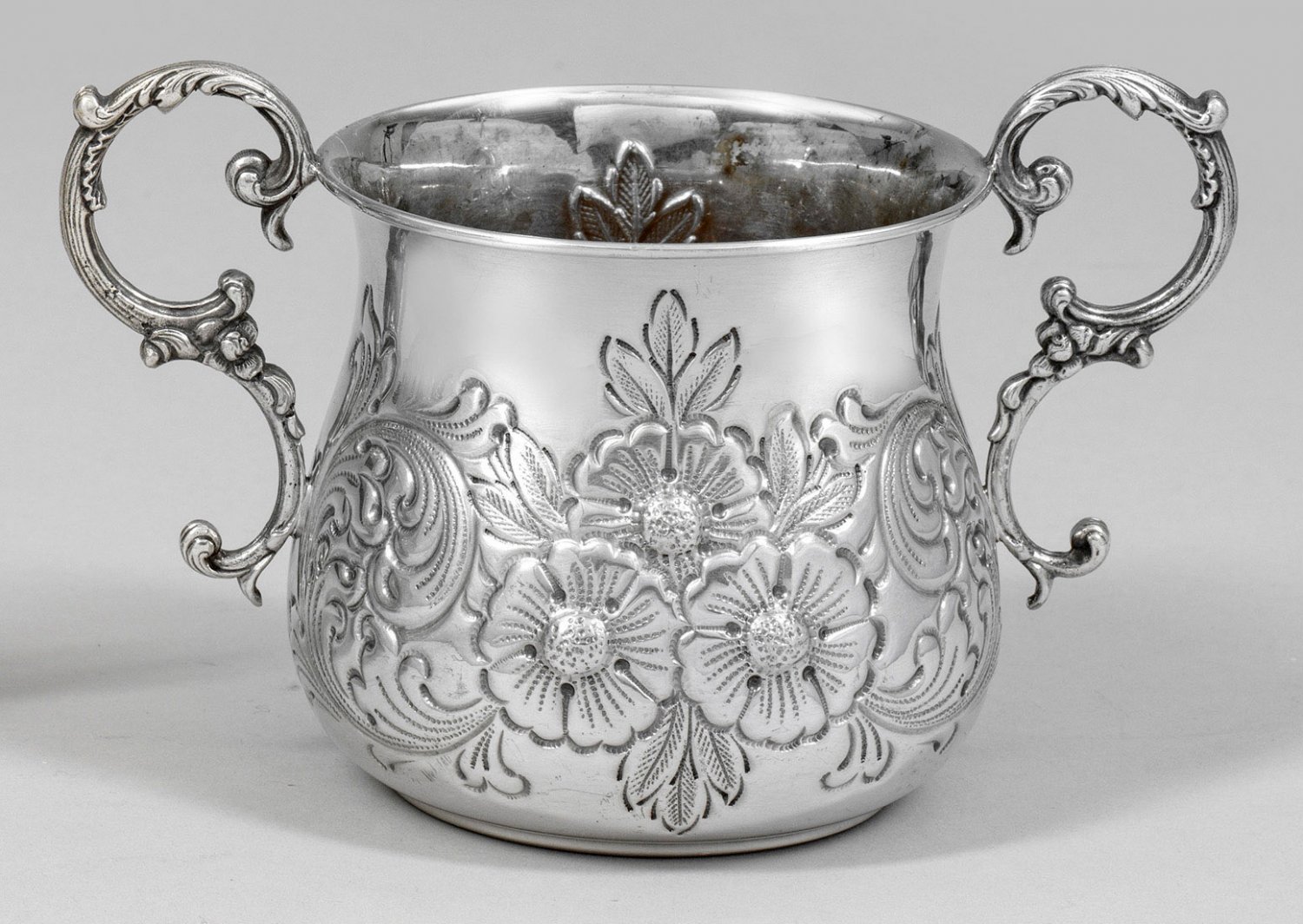 Henkelschale Silber. Über flachem Stand, bauchiger Korpus mit ausschwingendem Rand. Wandung mit umlaufendem reliefplastischem Blumendekor. Beidseitig Volutenhenkel. Innen vergoldet. Gest. 800, Herstellerzeichen. Gew. ca. 300 g. H. 11,5 cm.