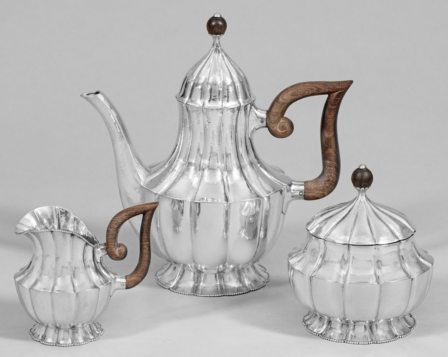 Art Déco-Kaffeeservice Silber. 3-tlg.; Kaffeekanne, Zuckerdose und Sahnegießer. Blütenförmiger, von einem Perlfries gerahmter Stand. Sich konisch erweiternder Korpus mit abgesetzter Schulter und hochgezogenem Hals. Korpus umlaufend fein martelliert sowie gegliedert durch breite Züge. Hochgezogener Deckel bekrönt von Kugelknauf aus Holz. J-Henkel aus Holz. Modell-Nr. 5073. Teilw. innen vergoldet. Gest. 800, Herstellerzeichen. Gew. zus. ca. 1050 g.