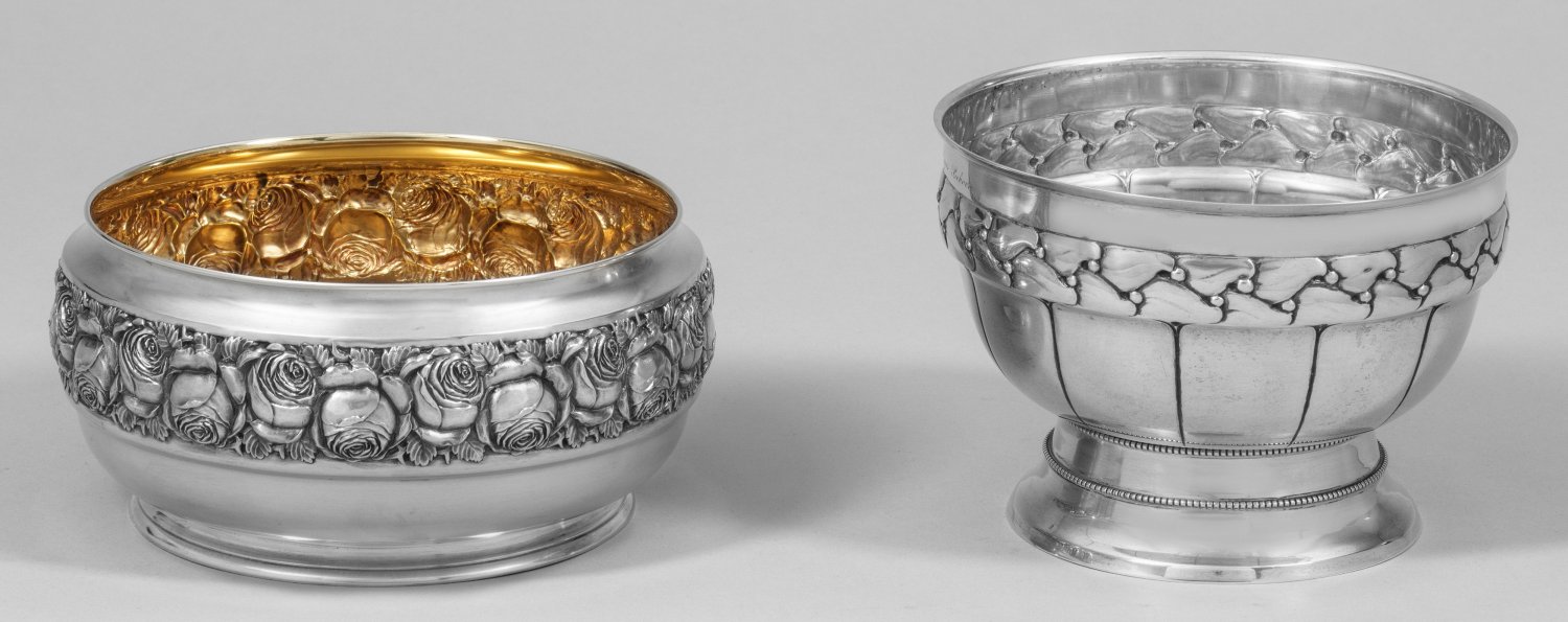 Zwei Schalen Silber. 2-tlg.; Dänische Jugendstil-Schale von 1917 mit godronierter Wandung und reliefiertem Blattfries, Widmungsgravur unter dem Rand. Gest. Beschau- und Herstellerzeichen für J. Grönlund, Ukend. Schale mit Rosenrelief. Gest. 800, Herstellerzeichen für Bruckmann. Gew. zus. ca. 605 g. H. 8 cm-11 cm. D. 15,5 cm-18 cm.