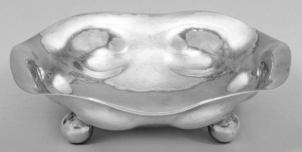 Große Art Déco-Schale Silber. Runde Form auf drei Kugelfüßen mit wellenförmig geschweiftem Rand und gebuckelter Wandung. Hammerschlagdekor. Gest. 800, Herstellerzeichen. Gew. ca. 760 g. D. 33 cm.