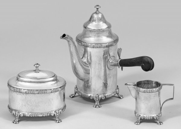 Art Déco- Kaffeeservice Silber. 3-tlg.; Kaffeekanne, Sahnegießer und Zuckerdose. Von vier Tatzenfüßen getragener zylindrischer Korpus mit flächendeckendem Hammerschlagdekor. Kaffeekanne mit abnehmbarem ebonisiertem Holzgriff. Unterseitig graviert mit Initialen und Datum. Stadtmarke, Herstellerzeichen. Gew. zus. ca. 1494 g. H. 8,7 cm - 24 cm.