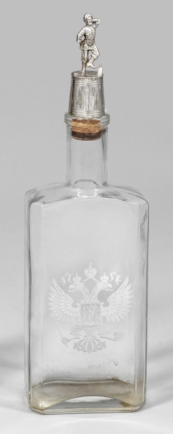 Wodkaflasche Silber, Glas. Achtkantflasche mit schablonengeätztem russischem Adlerwappen. Der Deckel in Form eines Fasses mit darauf tanzendem Kosaken und Wodkaflasche. Gest. Kokoschnikmarke, Herstellerzeichen EK, wohl für Erik August Kollin. H. 37 cm.