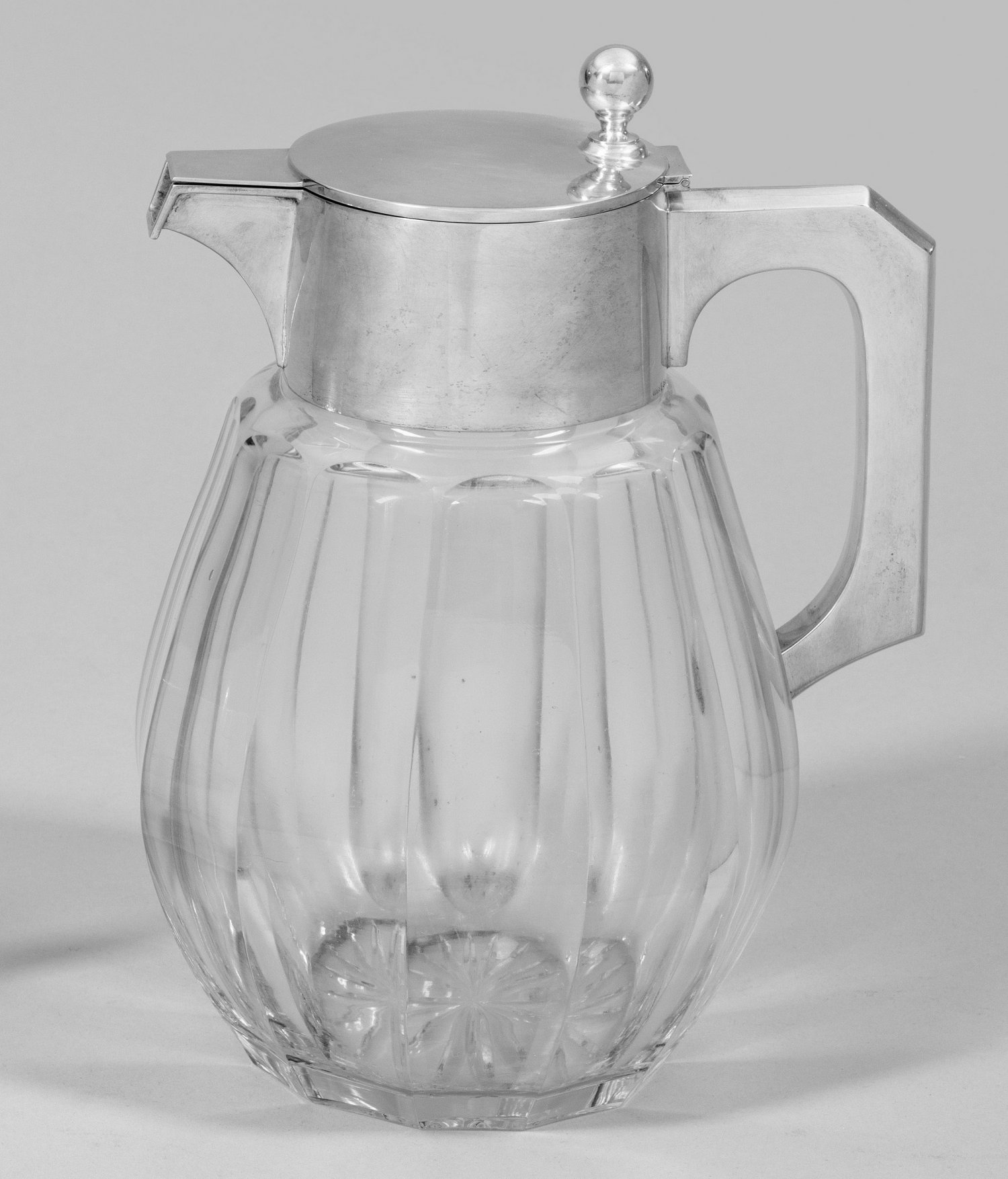 Saftkanne mit Silbermontierung. Gebauchter, umlaufend facettgeschnittener Korpus. Innen Glaszylinder. Glatte Montierung mit gewölbtem Deckel und gekanteter Griff aus Silber, gest. 835, Herstellerzeichen. H. 29 cm.