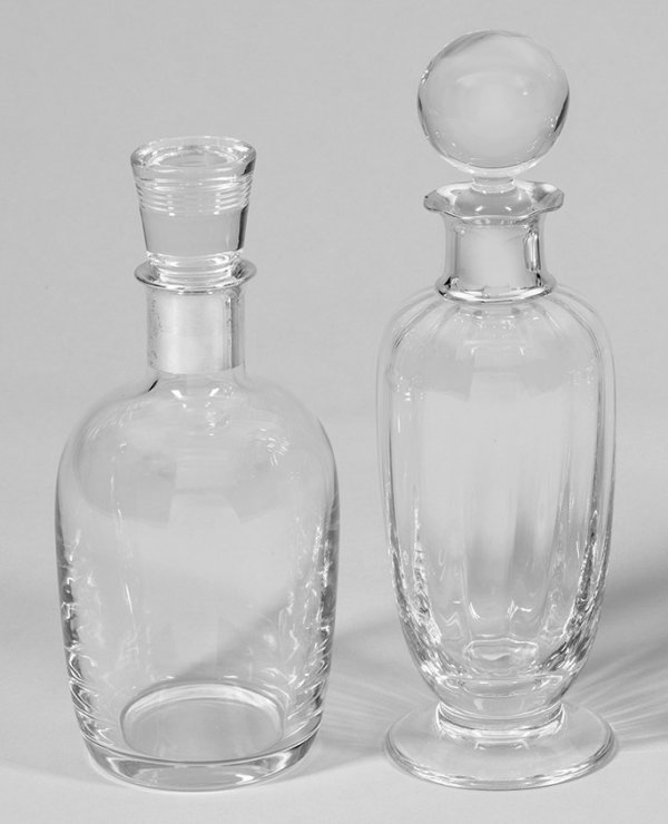 Paar Karaffen Silber, Glas. Konisch mit Silbermontierung und Stöpseln aus Glas. Gest. 925, Herstellerzeichen. Gew. zus. ca. 2490 g. H. 24,5 cm - 29 cm.
