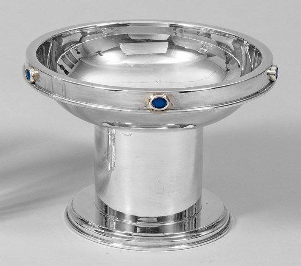 Modernistische Aufsatzschale Silber. Über flachem, profiliertem Stand hoher, zylindrischer Schaft. Leicht gemuldeter, glatter Korpus. Ausgestellter Rand dekorativ besetzt mit fünf blauen Farbsteinen. Gest. 900, Kennedy. Gew. ca. 760 g. H. 15,5 cm. D. 22 cm.