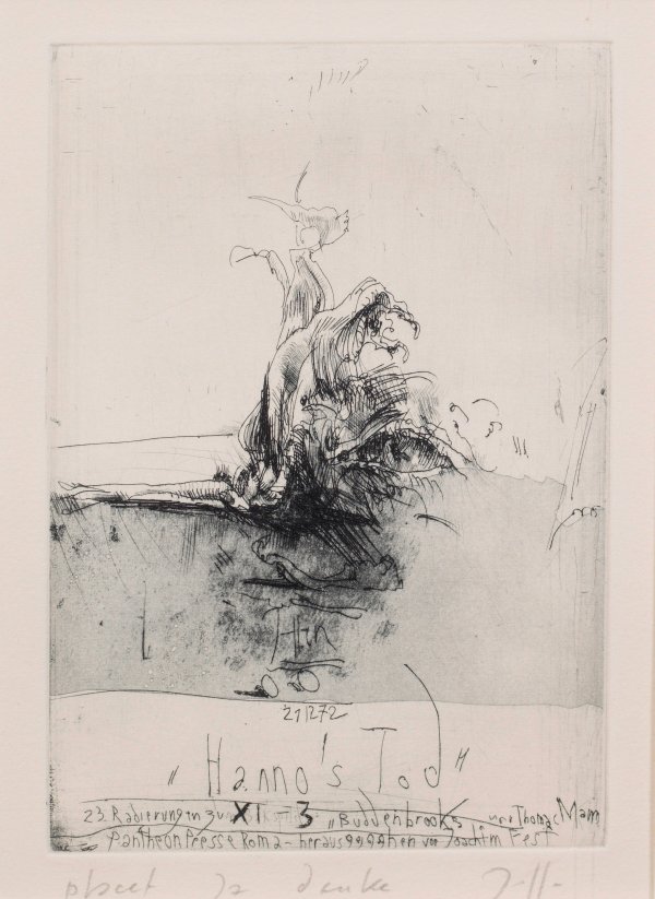 Radierung u. Aquatinta/Papier, 1972/73. Sign. u. vom Künstler bez.; Überdies in der Platte bez. u. dat. 21.12.(19)72. Probedruck außerhab der Auflage von 90 Exemplaren. Titelblatt zu "Hanno's Tod", 23 Radierungen zu XI-3 "Buddenbrooks" von Thomas Mann, erschienen in der Pantheon Presse, Rom. Hrsg. Joachim Fest, 1973. Plattenmaß 22,3 cm x 12,7 cm.