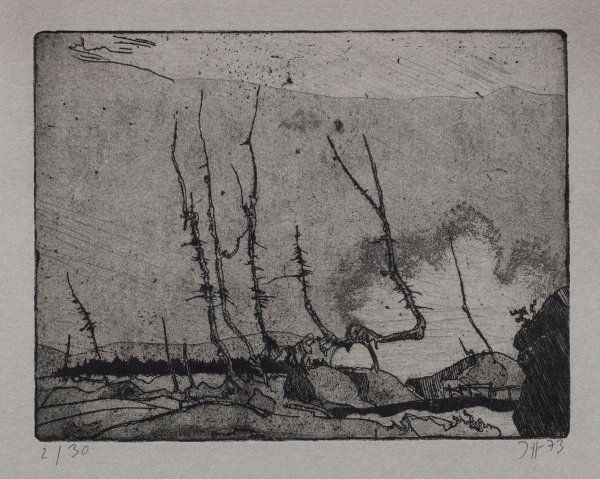 Radierung u. Aquatinta/hellgraues Papier, 1971/73. Sign., nummeriert 2/30 u. dat. (19)73. Aus der Propylaen-Mappe "Landschaften". Plattenmaß 15 cm x 19,6 cm; Blatt 28,5 cm x 39,8 cm.