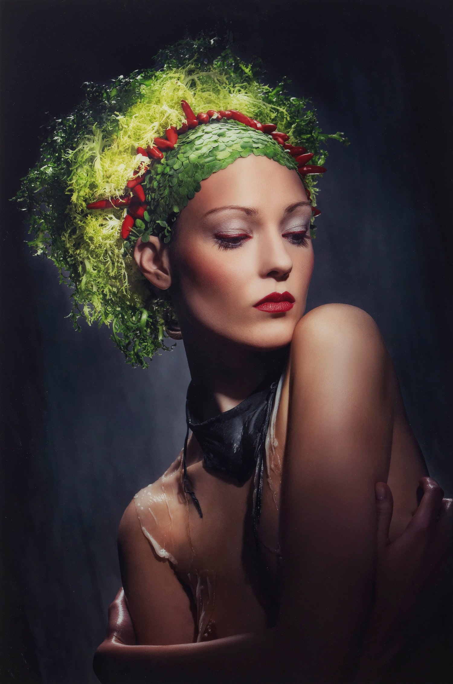 C-Print im Diasec-Verfahren auf Alu-Dibond aufgezogen. Um 2008. Motiv für das Cover des Bildbandes "Fashion Food" in Kooperation mit dem Starkoch Roland Trettle aus dem Salzburger Gourmet-Restaurant Ikarus, Hrsg. Collection Rolf Heyne, München 2008. Untere Ecken kaum merklich gestaucht, partiell zarte Oberflächenbereibungen, unterer Rand leicht fingerfleckig, sonst sehr guter Zustand. Ca. 180 x 130 cm.