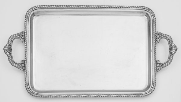 Qualitätvolles Henkeltablett Silber. Rechteckig mit schmalem, von einem Zungenfries umzogenem Rand. Glatter Spiegel. Hochgezogene Henkel. Gest. 800, Herstellerzeichen. Gew. ca. 1678 g. 61,3 cm x 34,2 cm.