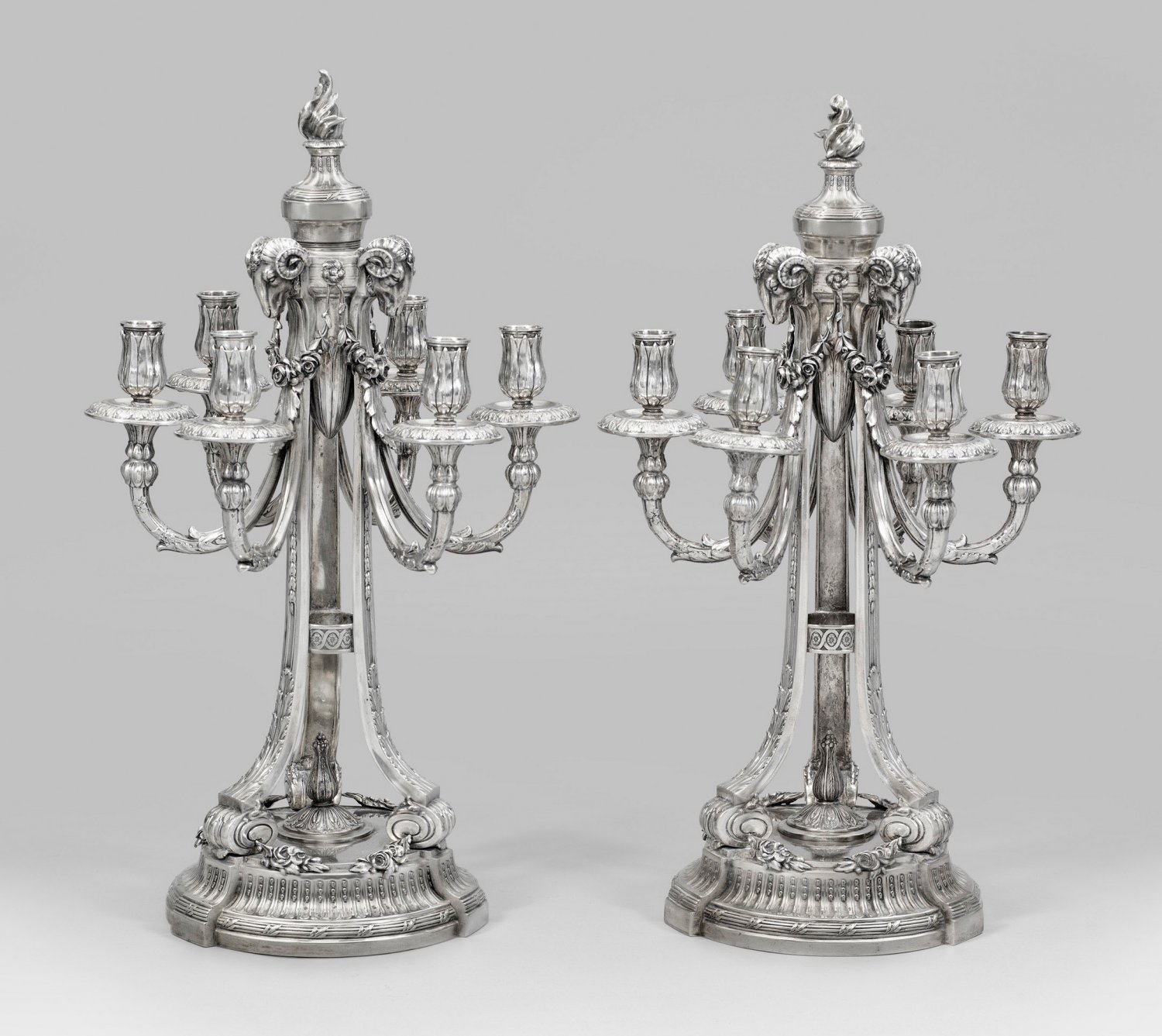Paar Prunkgirandolen von Bruckmann Silber. Auf gekehltem Rundfuß offen gearbeiteter und mit Akanthusblättern gerahmter, auf drei Volutenstützen gehaltener Schaft in plastischen Widderköpfen endend, umzogen von drei plastischen Blütenfestons. Davon ausgehend sechs geschweifte Leuchterarme mit blütenkelchähnlichen Tüllen. Als Bekrönung eine stilisierte Flamme auf gekehltem Schaft. Gest. 800, Herstellerzeichen Bruckmann, No 8387, Juweliermarke Julius Herz. Gew. zus. ca. 5540 g. H. 53 cm.