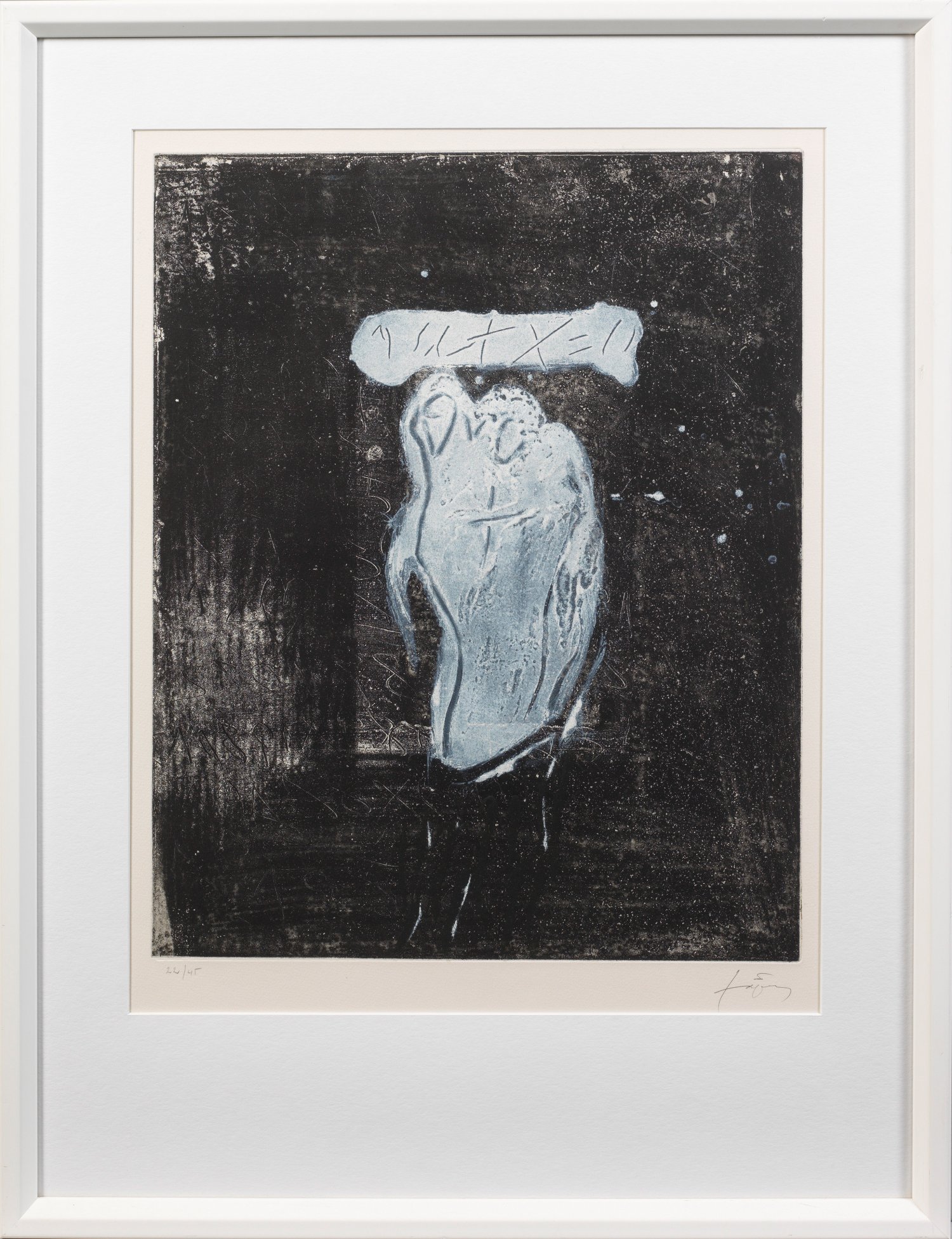 Aquatinta-Radierung mit Prägedruck in Schwarz, Weiß und Grau/Bütten, 1989. Sign. u. nummeriert 22/45. Eigenedition des Künstlers. Als bedeutendster spanischer Informel-Künstler kämpfte Tàpies mit schroffen Bildwirkungen, Reliefs und betonter Materialität gegen tradierte Sehgewohnheiten. 1959-1968 nahm er an der Documenta II-IV in Kassel teil. Plattenmaß 58 cm x 46,5 cm. Rahmen.