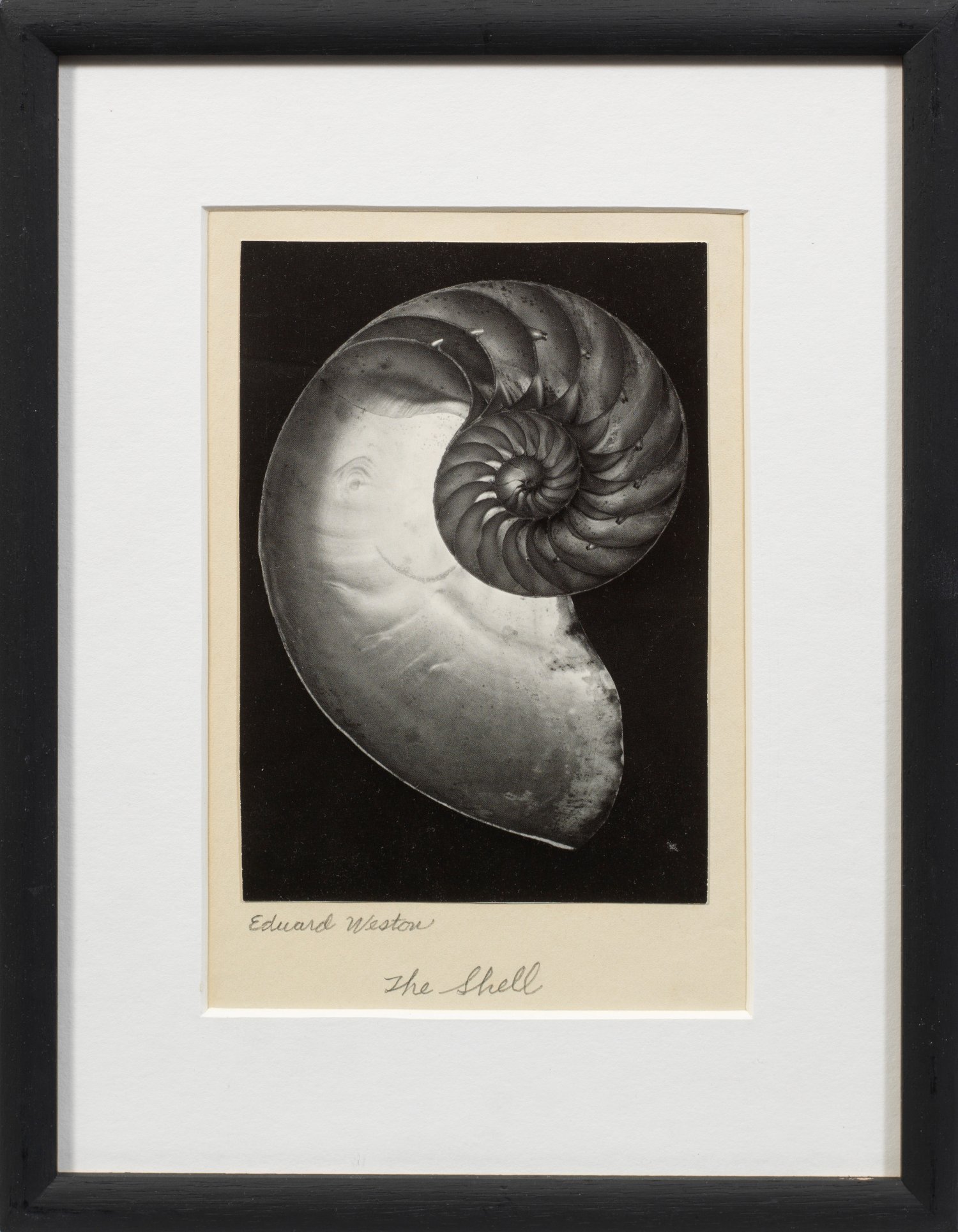 Silbergelatineabzug/glänzendes Papier. Späterer, wohl posthumer Abzug. Auf dem Hinterlegkarton von fremder Hand bez. u. betitelt "the shell". Zeigt Westons berühmte Fotografie des Querschnitts einer Nautilus-Schale. Fotografie 17 cm x 11,8 cm. Rahmen.
