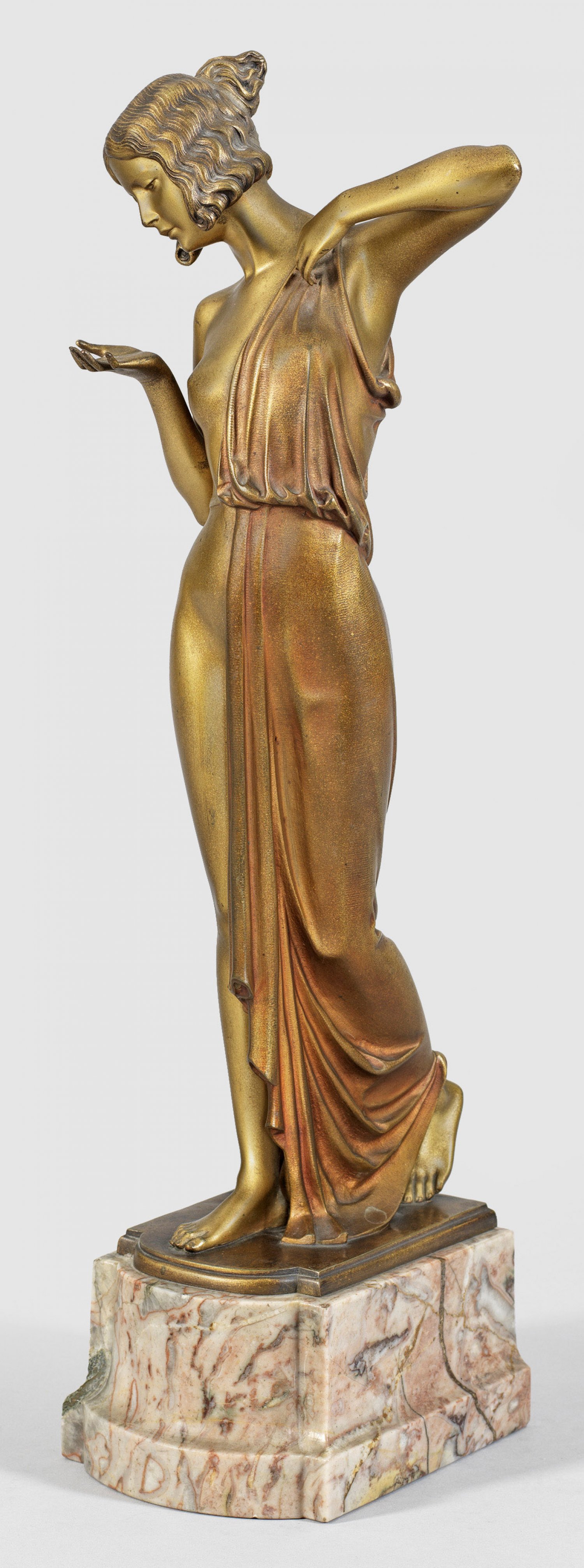Bronze, goldene Kaltpatinierung. Sign.; Gießerinschrift "Wiener=Kunstwerkstätten. Geb. Brandel. Berlin.". Rosafarbener Marmorsockel. Auf einer flachen Plinthe schreitene junge Frau, deren linke Seite von einem lang fallenden Kleid bedeckt ist und die auf ihre rechte Hand schaut. Seltene Jugendstil-Statuette des Bildhauers, der seit 1900 in Berlin ansässig war und dort auch die Grosse Berliner Kunstausstellung beschickte. Ohne Kugel. Ges.-H. 50 cm.