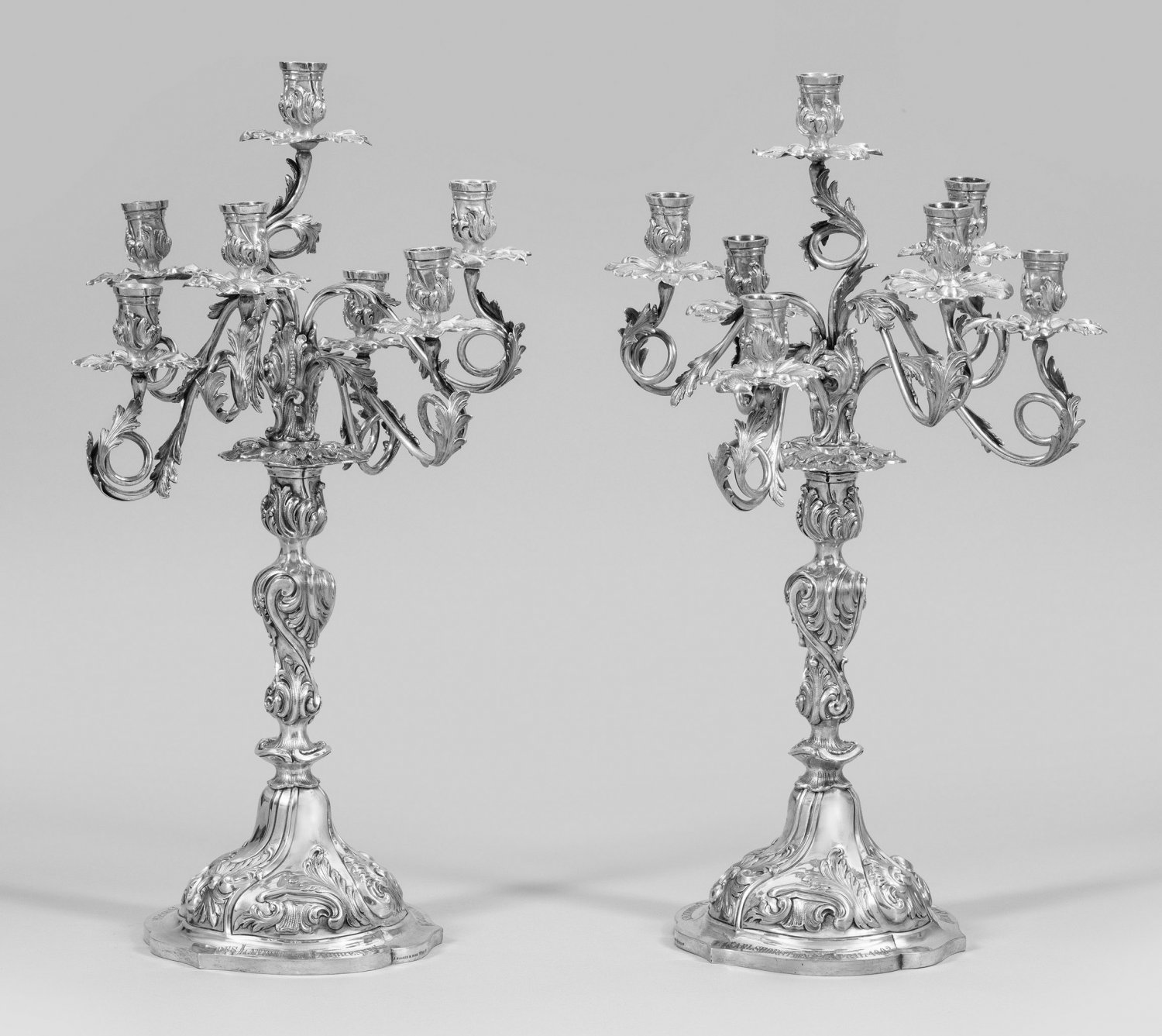 A pair of impressive Rococo style 7-light girandoles. Standard mark 800, maker´s mark.