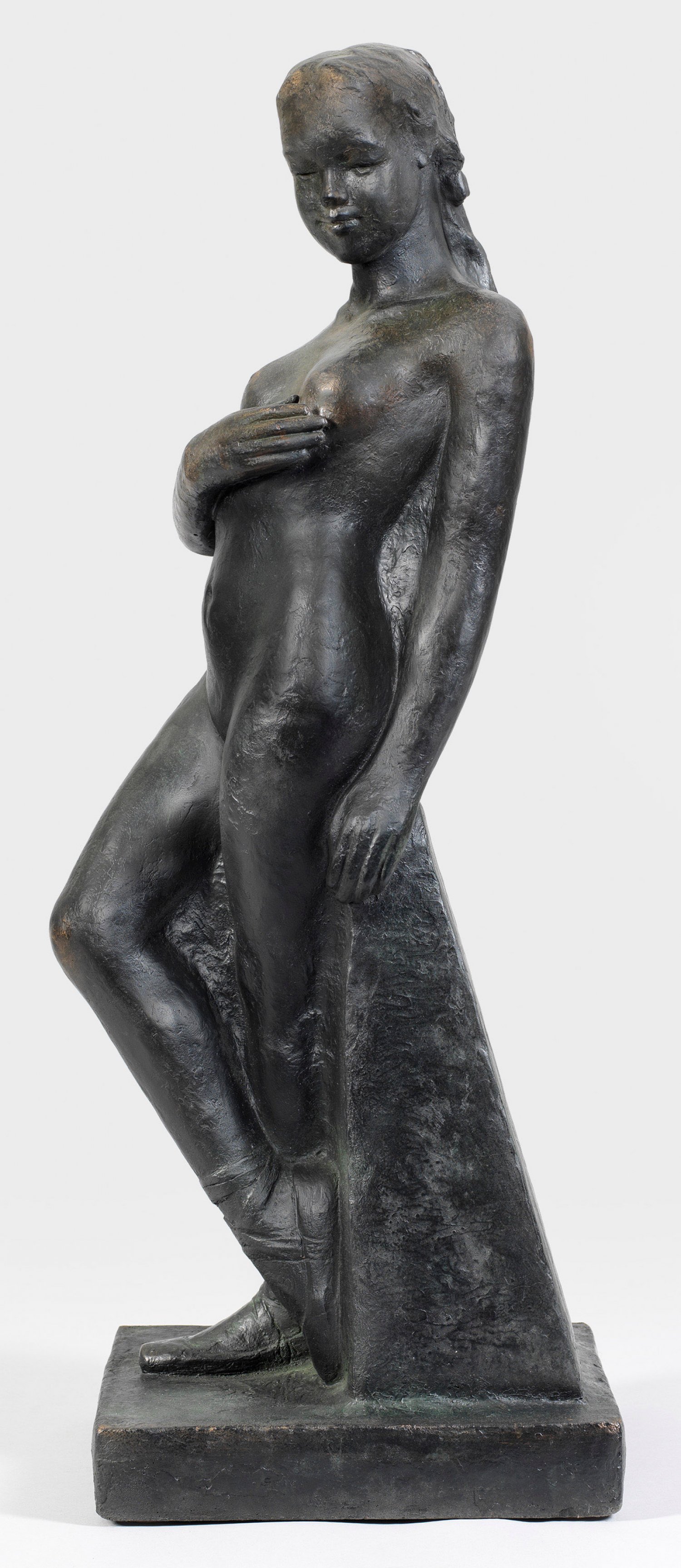 Bronze, dunkelbraun patiniert, 1921. Sign. u. Dat.; Steinsockel. Große Aktfigur der Klassischen Moderne mit vollplastischer Darstellung einer Tänzerin, die in graziöser, ausdrucksvoller Pose und ganz in den Tanz vertieft mit einem Fuß auf einer kugelig gewölbten Plinthe steht, den Kopf zur Seite neigt und die rechte Hand an die linke Schulter legt. Seltene Bronzeplastik Paul Seilers, der nach Studien in Paris ab 1901 in Frankfurt ansässig war. Dort schuf er als gefragter Bildhauer eine Reihe von Denkmälern und Skulpturen für den öffentlichen Raum wie seine stilistisch vergleichbare "Flora" in der Taunusanlage. 1918 zeigte Seiler auf der Großen Berliner Kunstausstellung eine "Tänzerin" aus Keramik. H. 56,5 cm; Ges.-H. 76,5 cm.