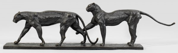 Bronze, dunkel patiniert. Posthumer, zeitgenössischer Guss, Ende 20./Anfang 21. Jh., nach der um 1912 geschaffenen, berühmten Bronzeplastik. Als eine der spektakulärsten Großkatzendarstellungen Bugattis spiegelt sie seine große Beobachtungsgabe wider, wie er bei umrisshafter Stilisierung der eleganten, kraftvollen Tiere zugleich das Balzverhalten des Leopadenpaares zum Ausdruck bringt. H. 23,5 cm; B. 86 cm.