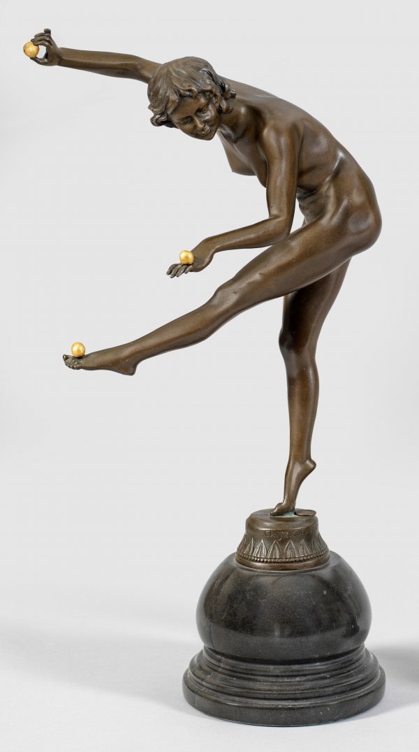 Jugendstil-Aktfigur einer balancierenden Tänzerin mit Kugeln
