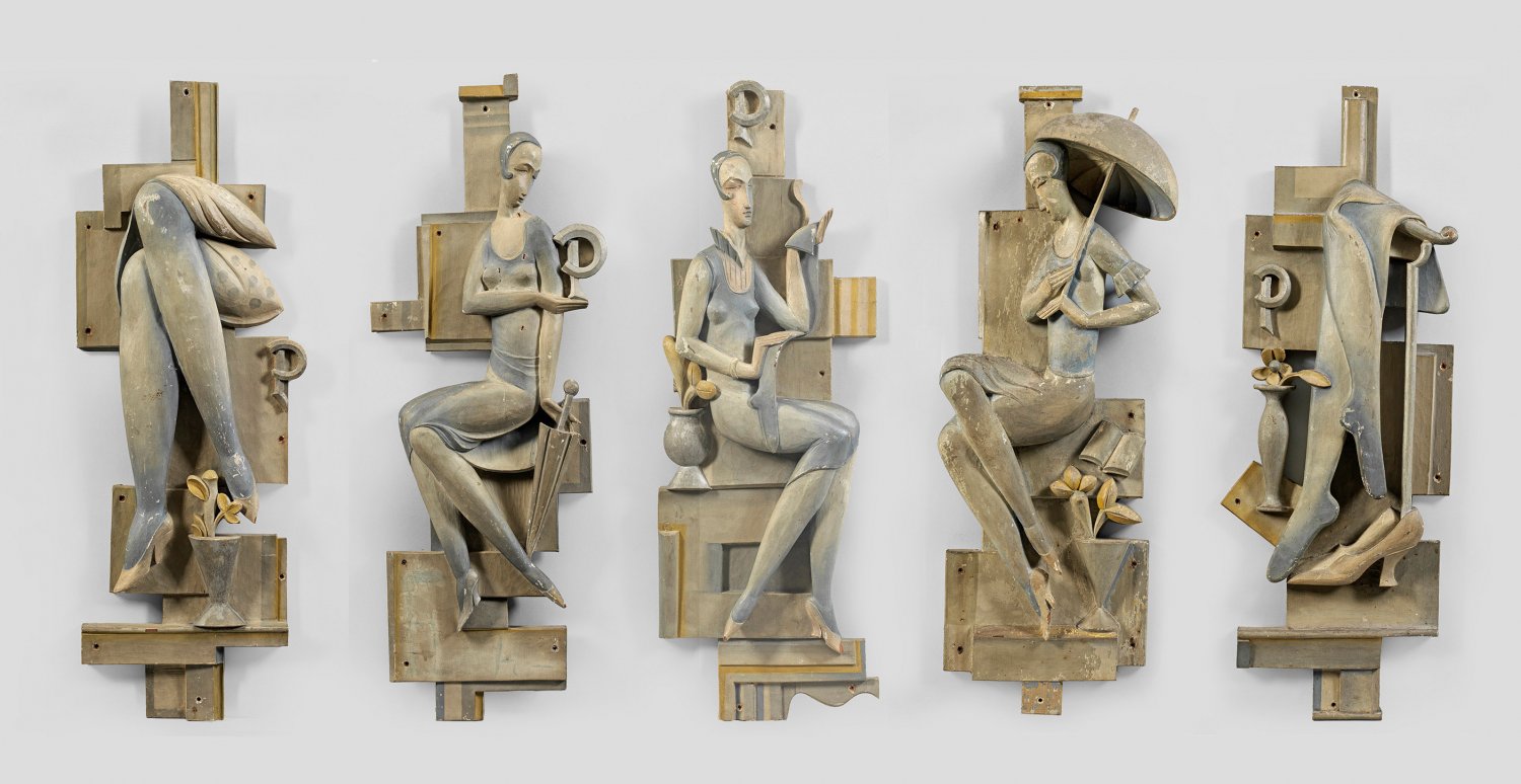 German sculptor active circa 1930. A set of five carved and wooden Art Deco reliefs made for the well known shoe shop of Wilhelm Prange in Hamburg. Due to use some minor signs of weather conditions and minor flaws.
