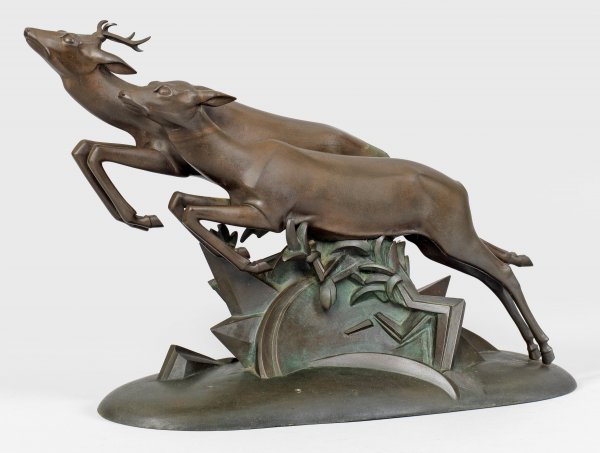 Bronze., dunkelbraun patiniert, um 1924-1926. Sign.; runder Gießerstempel von "BRÄUNLICH & LANGLOTZ", Berlin. Auf einer ovalen Plinthe mit straff geometrisch stilisiertem Waldboden ein springendes Rehpaar. Seltene Bronzeausführung der Art Déco-Plastik, die in den 1920er Jahren auch durch die Rosenthal-Kunstabteilung in Selb in Porzellan ausgeformt wurde und die er 1926 auf der Großen Berliner Kunstausstellung zeigte. H. 24,5 cm; B. ca. 37 cm.