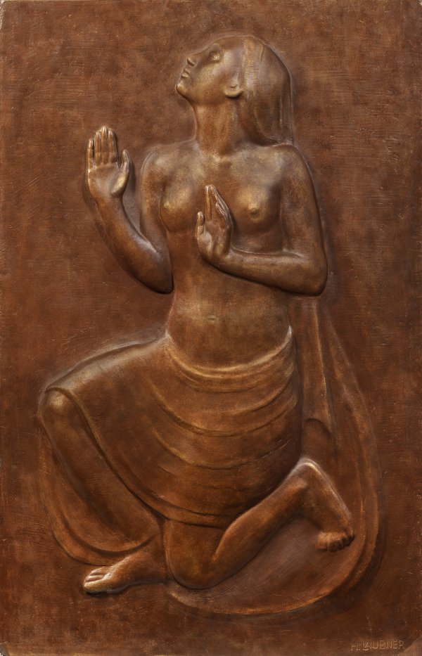 Gips, dunkelbraun-bronzefarben gefasst. Sign.; Verso Wandaufhängung. Wohl um 1920-1930 geschaffenes, modernes Relief Laubers mit der Darstellung einer Tänzerin als Halbakt in adorierender Pose. Laubner studierte an der renommierten, fortschrittlichen Unterrichtsanstalt des Kunstgewerbemuseums in Berlin und an der Akademie in Leipzig. Bekannt wurde er seit den 1920er Jahren durch Entwürfe für die Kieler Kunstkeramik und durch eine Reihe von Skulpturen für den öffentlichen Raum, u. a. für das Konzerthaus "Die Glocke" in Bremen. Ger. rest.; 125 cm x 81 cm.