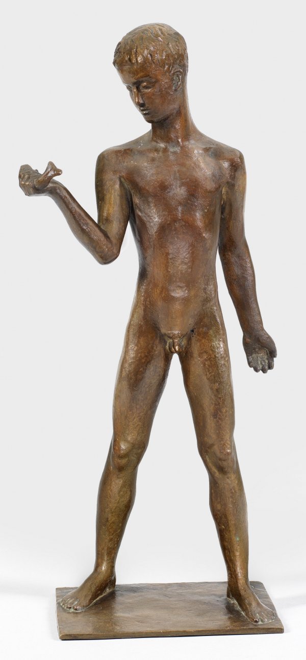 Bronze, dunkelbraun patiniert, 1940. Ligatur-Monogr.; Auf einer flachen, rechteckigen Plinthe vollplastisch gearbeitete, moderne Aktstatuette eines Jünglings mit gefangener Forelle in der rechten Hand. Frühe Bronzeplastik Kleins, der bei Hermann Hahn an der Kunstakademie in München und an den Vereinigten Staatsschulen für Freie und Angewandte Kunst in Berlin bei Wilhelm Gerstel studierte, zu dessen Schülern auch Fritz Cremer und Gustav Seitz gehörten. Um 1940 war Klein Mitglied der Ateliergemeinschaft Klosterstraße in Berlin, wo er neben bedeutenden Bildhauern wie Hermann Blumenthal, Ludwig Kasper, Kurt Lehmann, Gerhard Marcks und Richard Scheibe arbeitete. Nach 1945 wurde er in Bückeburg ansässig. H. 50,5 cm.