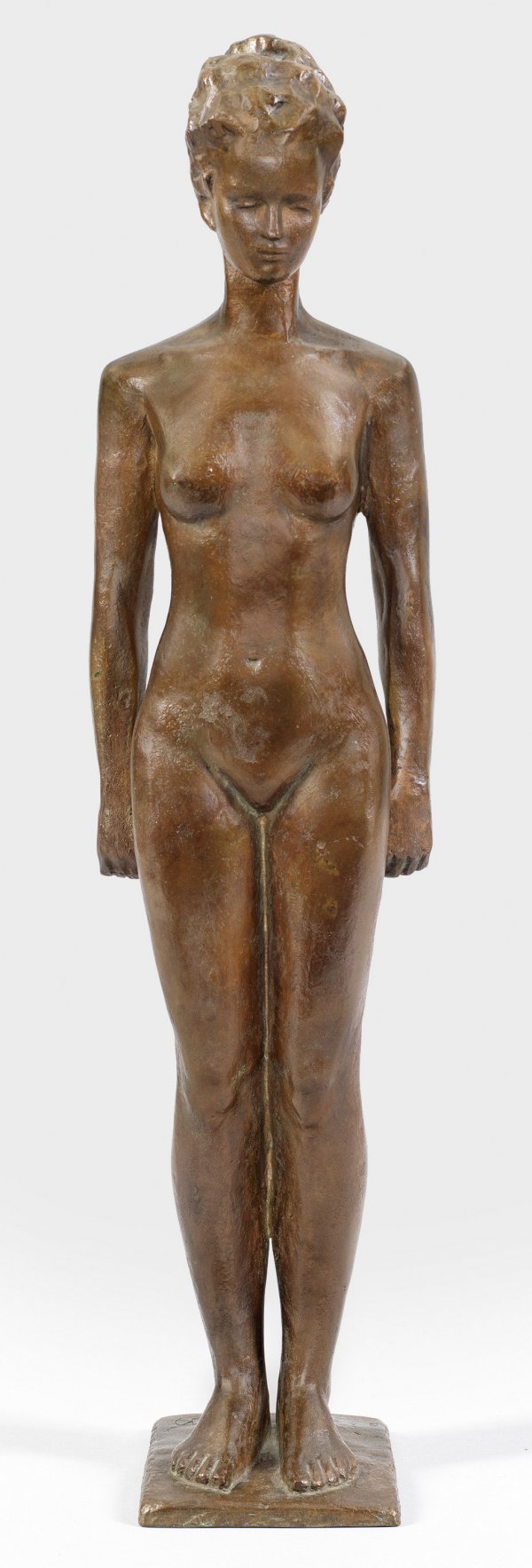Bronze, dunkelbraun patiniert. Ligatur-Monogr.; Nummeriert "IV". Gießerstempel "W. FÜSSEL BERLIN 10". Aktstatuette der Klassischen Moderne. Wohl um 1940 entstandene Bronzeplastik Kleins, der bei Hermann Hahn an der Kunstakademie in München und an den Vereinigten Staatsschulen für Freie und Angewandte Kunst in Berlin bei Wilhelm Gerstel studierte, zu dessen Schülern auch Fritz Cremer und Gustav Seitz gehörten. Um 1940 war Klein Mitglied der Ateliergemeinschaft Klosterstraße in Berlin, wo er neben bedeutenden Bildhauern wie Hermann Blumenthal, Ludwig Kasper, Kurt Lehmann, Gerhard Marcks und Richard Scheibe arbeitete. Nach 1945 wurde er in Bückeburg ansässig. H. 62,5 cm.