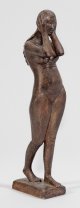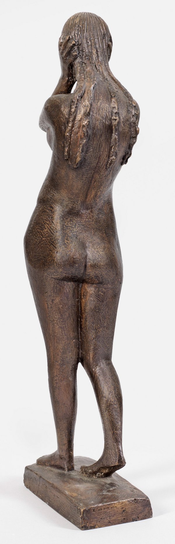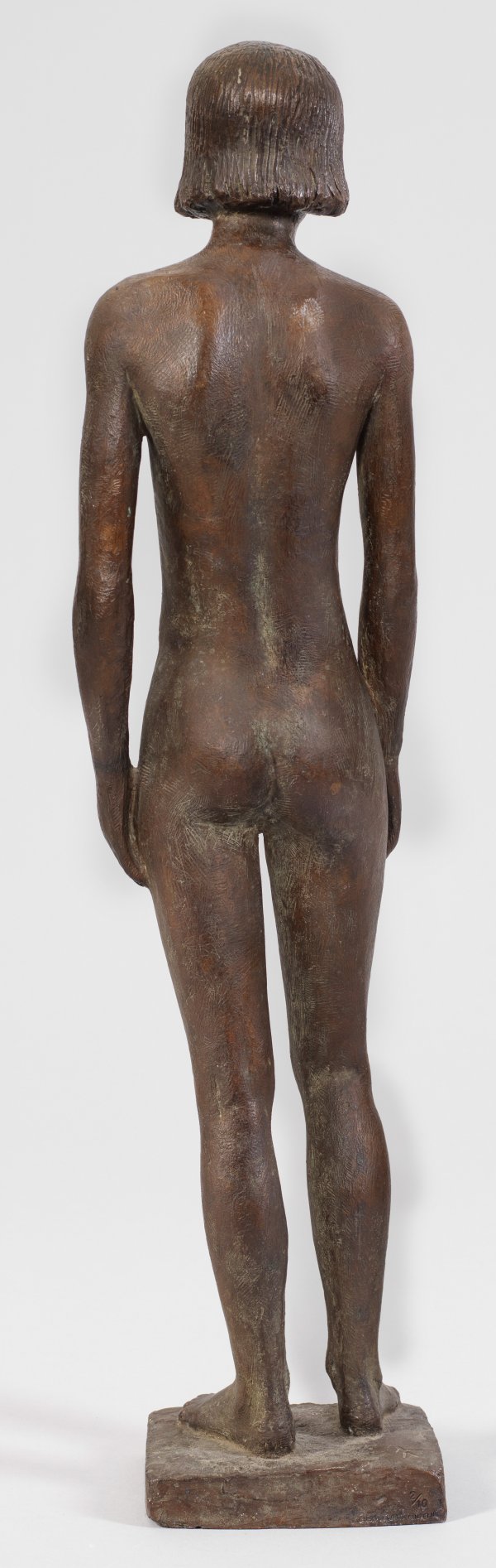 Bronze, dunkelbraunschwarz patiniert, 1951. Sign. (Künstlersignet "Phönix"); Nummeriert "V"; Gießerstempel "GUSS BARTH RINTELN". Guss nach 1970. Wvz. Rudloff 567. Der Bildhauer schildert Eva in dieser Aktstatuette im Moment der Erkenntnis des verlorenen Paradieses in ihrer ganzen Verzweiflung mit seitlich an den Kopf gelegten Händen. Marcks, der 1919-1933 am Bauhaus und an der Burg Giebichenstein gelehrt hatte, gehörte im "Dritten Reich" zu den verfemten Künstlern der Moderne. Nach 1945 wandte er sich in mehreren Werken dem Thema der Schuld zu. Bei dieser Plastik griff er auf Zeichnungen zurück, die 1930 zur "Thüringer Venus" führten, ergänzt um neuere Vorzeichnungen um 1950. Das zeigt, dass sich Marcks oft über einen längeren Zeitraum mit bestimmten Motiven befasste und ältere Ideen wieder aufgriff. H. 57,2 cm.