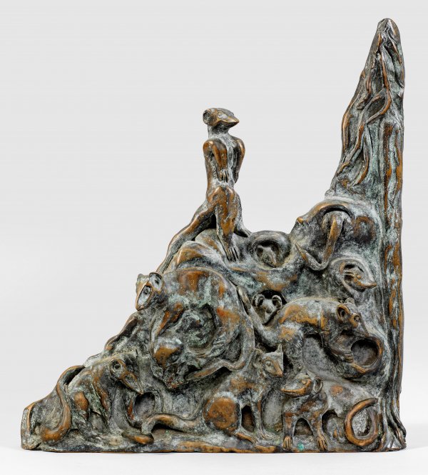 Bronze, braun patiniert. Partiell fast vollplastisch gestaltetes Relief mit modern stilisierter Darstellung einer Erdmännchenkolonie an ihrem Bau, welche zugleich den Charakter der Tiere wiedergibt. 42,8 cm x 38 cm x 8,2 cm.