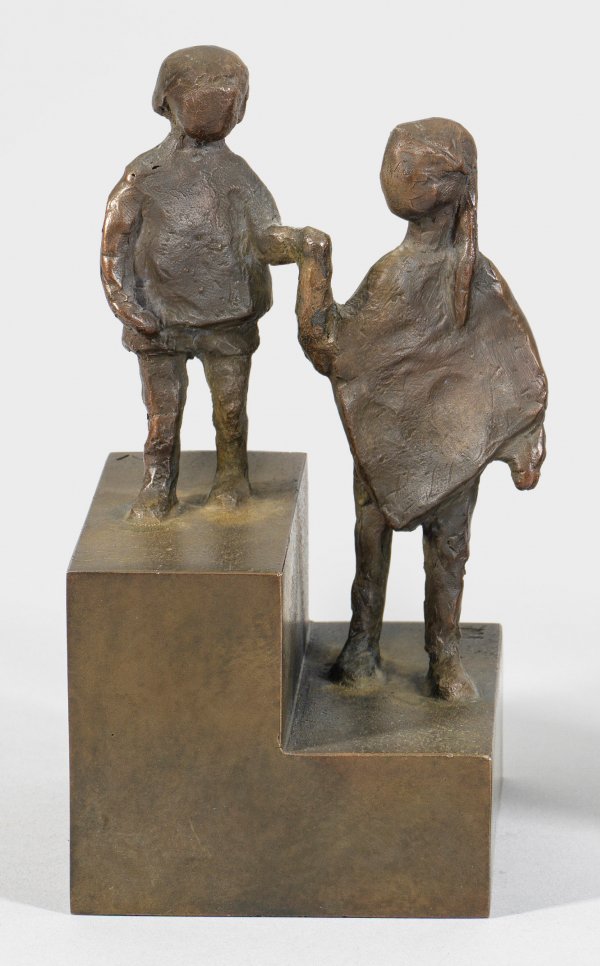 Bronze, dunkelbraun patiniert Ligatur-Monogr. "WV". Gießerstempel "KUNSTGUSS ESCHENBURG LAHN-DILL". Moderne Bronze mit der Darstellung einer Schwester, die ihren jüngeren Brüder beim Laufen auf einer Treppe führt. H. 16,8 cm.