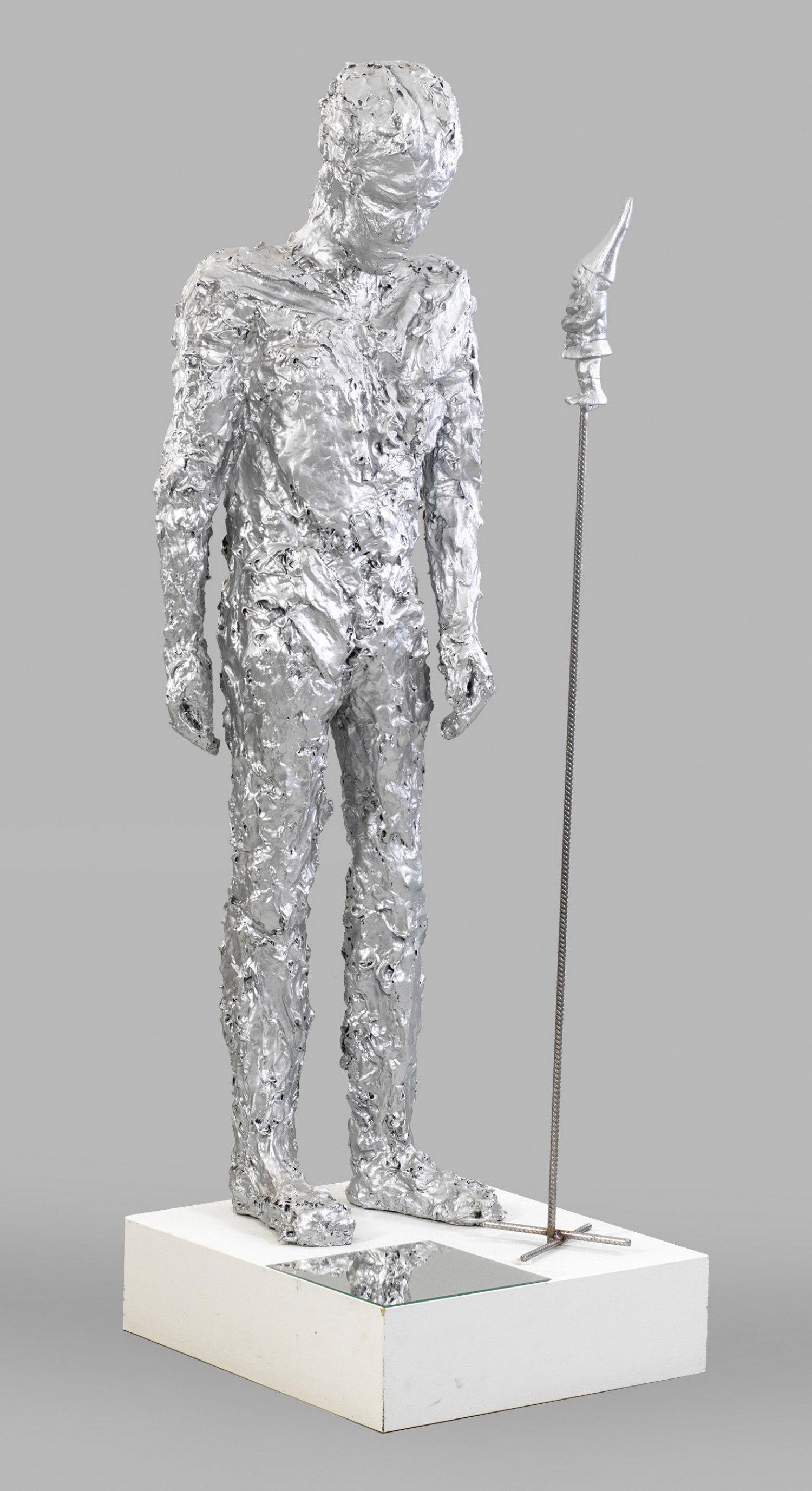 Zwerg Gusseisen mit Bewehrungs-Stahlmontierung, silberfarben gefasst; Figur Chromstahl, Glasfaser und verstärkter Polyester, silberfarben gefasst; Sockel aus weißgefassten Platten (wohl MDF) mit Spiegelfläche. 2017 entstandene, vollplastische Skulpturengruppe aus einer stilisierten männlichen Figur, die zum Boden auf einen Spiegel hinabschaut, ihm gegenüber in Schulterhöhe ein auf einen Stahlstab montierter Zwerg. Die Figur des Menschen blickt zugleich nach unten und mittels des Spiegels in den Himmel; zugleich tritt diese durch den Spiegel und die reflektierende, silberne Fassung der starken Oberflächenrelieferungen in einen Dialog mit dem Zwerg und den Umgebungssraum. In seinen Arbeiten reflekiert Thomann, der als Bildhauer, Installations- und Raumkünstler, Maler und Grafiker tätig ist, über Leben und Tod, die allgemeingültigen Sichtweisen von Mensch, Natur und Metaphysik, die menschliche Wahrnehmung und Empfindung. 1978-1980 besuchte er die Kunstgewerbeschule in St. Gallen, 1981-1983 die Meisterklasse von Mario Merz in Salzburg. Schon 1979 erhielt er eine erste Einzelausstellung, der zahlreiche weitere Einzel- und Gruppenausstellungen mit Preisen sowie Aufträge für Kunst am Bau und Freiskulpturen im In- und Ausland folgten. Figur H. 178; Ges.-H. 196. Sockel 70 cm x 60 cm.
