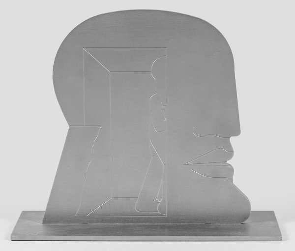 Edelstahl. Sign. u. nummeriert 41/65. Für die Unicef in einer Sonderedition geschaffene Arbeit des Künstlers. Die auf einer Rechteckplinthe montierte Platte mit stilisiertem Profilkopf verbindet das Kopfmotiv durch eine feine Linienzeichnung mit einem Mann, der ein Haus betritt. Formal reduzierte, monolithisch wirkende, sog. "Kopffüßler" und maskenhafte Profilköpfe sind seit 1962/63 zentrale Motive seines Oeuvres: "Im Kopf kann alles passieren, aber der Kopf schützt auch den Menschen. Es gibt offene, bewohnbare Köpfe. Der ganze Mensch ist im Kopf enthalten. Und es gibt den leeren Kopf, der alles aufnehmen kann und wieder alles abgibt." (Zit. H. Antes in: "Horst Antes", Ausstellungs-Kat. Hannover u. Bremen, S. 26). Antes nahm 1964, 1968 und 1977 an den documenta-Ausstellungen in Kassel teil, 2013 fand eine große Retrospektive im Berliner Martin-Gropius-Bau statt. 28,5 cm x 34 cm x 10 cm.