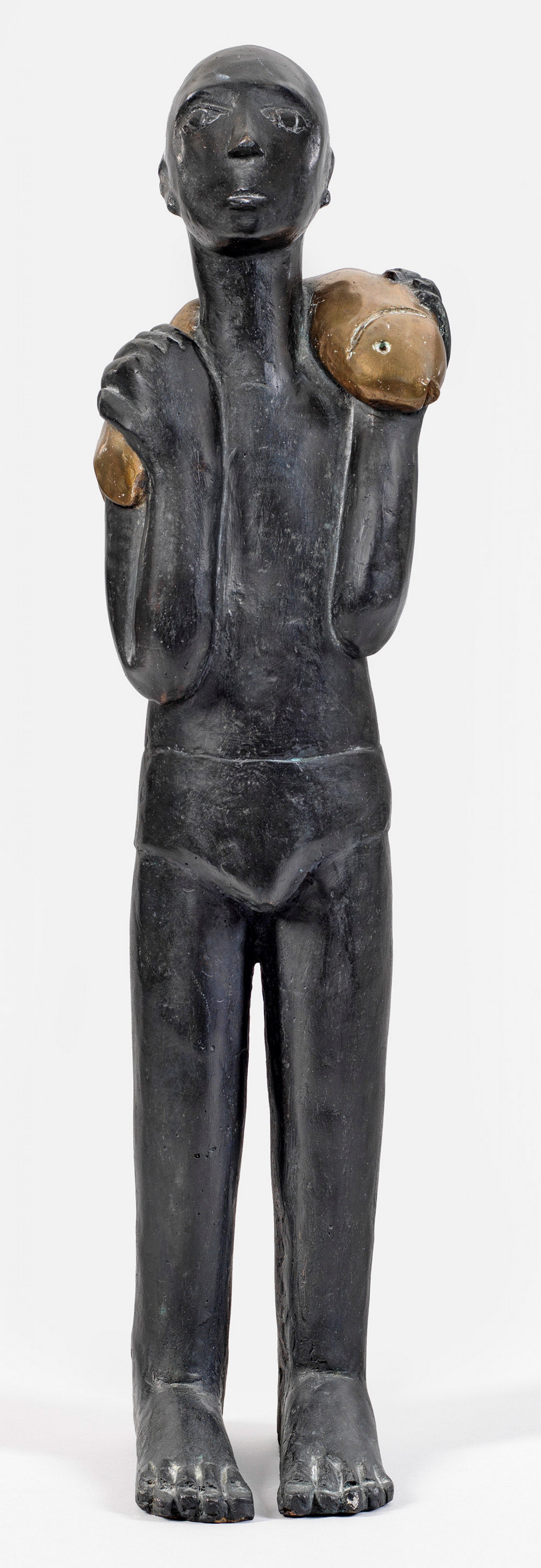 Blockhaft stilisierte, auf das Wesentliche reduzierte Darstellung eines Mannes in kurzer Badehose, der mit beiden Händen einen großen Fisch auf der Schulter trägt. Hermann studierte nach einer Steinmetzausbildung (1983-1986) von 1990 bis 1997 an der Hochschule für Künste in Bremen, 1996-1997 als Meisterschüler bei Professor Altenstein. Bereits seit 1993 stellt er vielfach in Museen, Kunstvereinen und Galerien in ganz Deutschland aus. H. 66 cm.