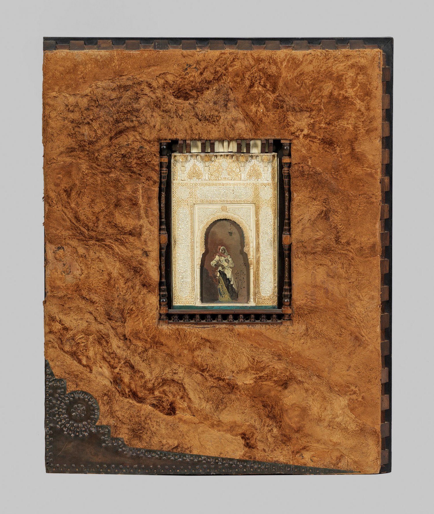Ebonisiertes Holz und Nussbaum, mit Einlagen sowie aufgerautes, naturbelassenes Leder und ornamentierte Applikationen aus Kupferblech. Gelblich patiniertes Stuckelement. Hochrechteckiges Paneel, zweiseitig mit gekantetem Abschluss. Flächendeckende Bespannung aus Leder sowie linksbündige ornamentierte Kupferapplikation. In der Mitte hochrechteckige Reserve, flankiert mit teilw. von geprägtem Kupfer umwickelten Vollsäulen als Rahmung für eingelassene Architekturplakette mit reliefplastisch gestaltetem maurischen Torbogen sowie reich gestalteten Ornamentfriesen. Dahinter bemalte Metallplakette mit junger Orientalin und Ampelmotiv. Unbez.; H. 76,5 cm x 60 cm.