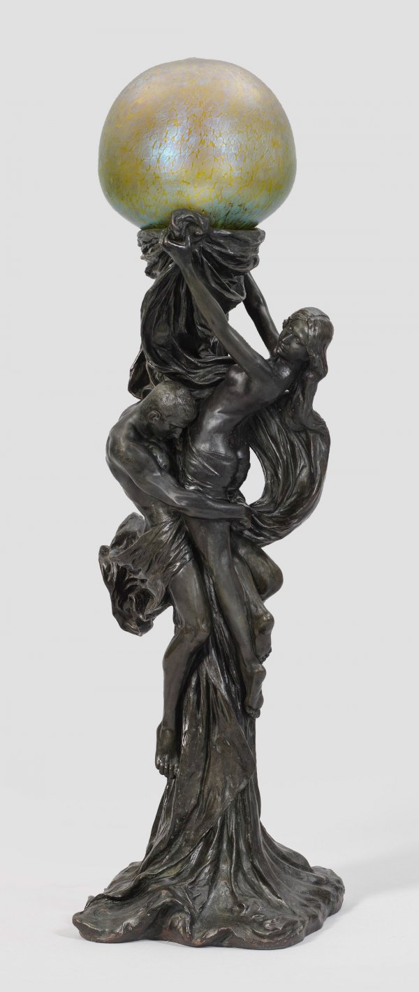 Wiener Jugendstil-Figurenstandlampe mit jungem Liebespaar 1-flg.; Galvanoplastik, dunkel patiniert; kugeliger Loetz-Schirm mit "Creta Papillon"-Dekor aus grünem Glas mit Silberkröseleinschmelzungen, reduziert und irisiert. Symbolistischer bzw. allegorischer, vollplastischer Fuß und Schaft in Gestalt eines Liebespaars als von Tüchern umschlungene Akte, der Mann hierbei die Frau mit einer Tuchdraperie als Schirmfassung emporhebend. Elekrifiziert. Ges.-H. 117 cm.
