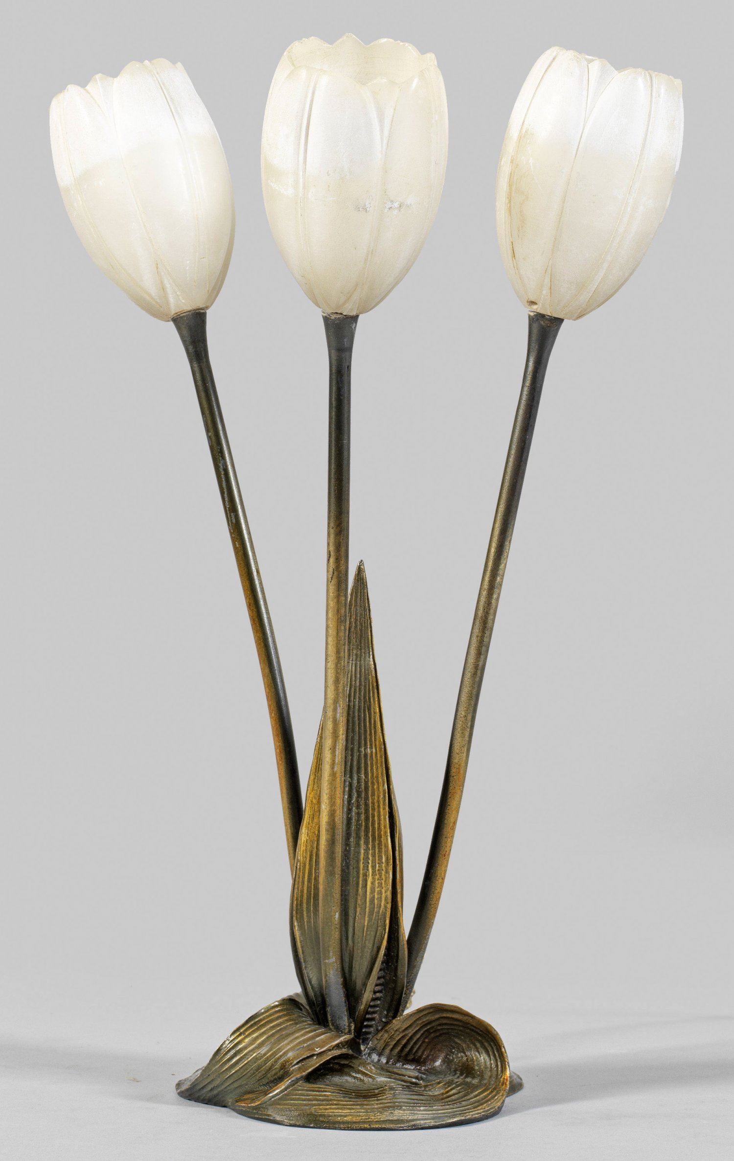 Tulpen-Tischlampe von Albert Cheuret Braun patinierte Bronze, Alabaster. Als drei stilisierte, blühende Tulpen gestaltete Lampe. Zwei der Schirme rest.; Sign.; Entw. Albert Cheuret. Alt elektrifiziert. H. 38,5 cm.