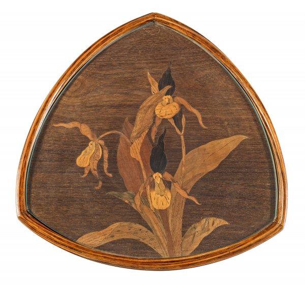 Tablett mit Frauenschuh-Dekor von Emile Gallé Nussbaum, Intarsiendekor aus unterschiedlichen Edelhölzern. Dreipassige Form auf drei niedrigen Füßen. Sign. Gallé. H. 4 cm; 35,2 cm x 34 cm.
